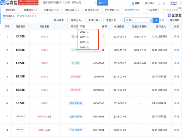 根据公开资料显示,目前百度在线网络技术(北京)有限公司已申请注册多枚“ERNIE”“ERNIEAI”“ERNIENLP”“ ERNIE-VILG”商标,其中多枚已注册成功,国际分类包括网站服务、科学仪器,这些商标最早申请于2019年6月,最新申请于今年1月3日。